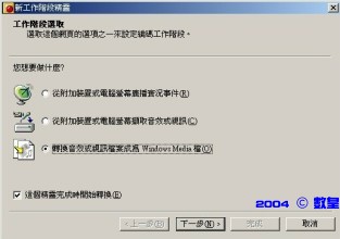 一、在Meun Bar中,選取 "工作階段 ---> 新工作階段精靈"。就會出現以下的畫面,選取 "轉換音效或視訊檔為Windows Media"。接著按"下一步"。
