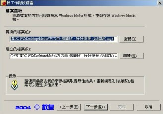 二、在"檔案選取"中,選取想轉換之音樂檔及轉換後wma儲存的位置。接著按"下一步"。
