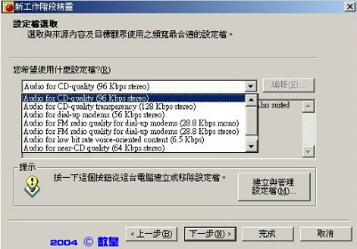 三、在 "設定檔選取" 中,選取選擇 "Audio for dial-up modems (56 Kbps stereo)" 或 "Audio for near-CD quality (64 Kbps stereo)",這全看你照不照顧56K的用戶。接著按"下一步"。